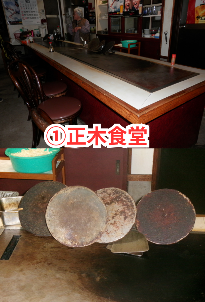 正木食堂は、長く続く昔から愛されている90歳を超えているおばあちゃんが経営している お好み焼き屋さんです。「お好み焼きのおいしさの秘密は、やわらかいキャベツから出る甘味と自分のうで」と言われてました。写真にのっている肉抑えと大きな鉄板でお好み焼きを作っていて おいしいので是非食べてみてください!!、