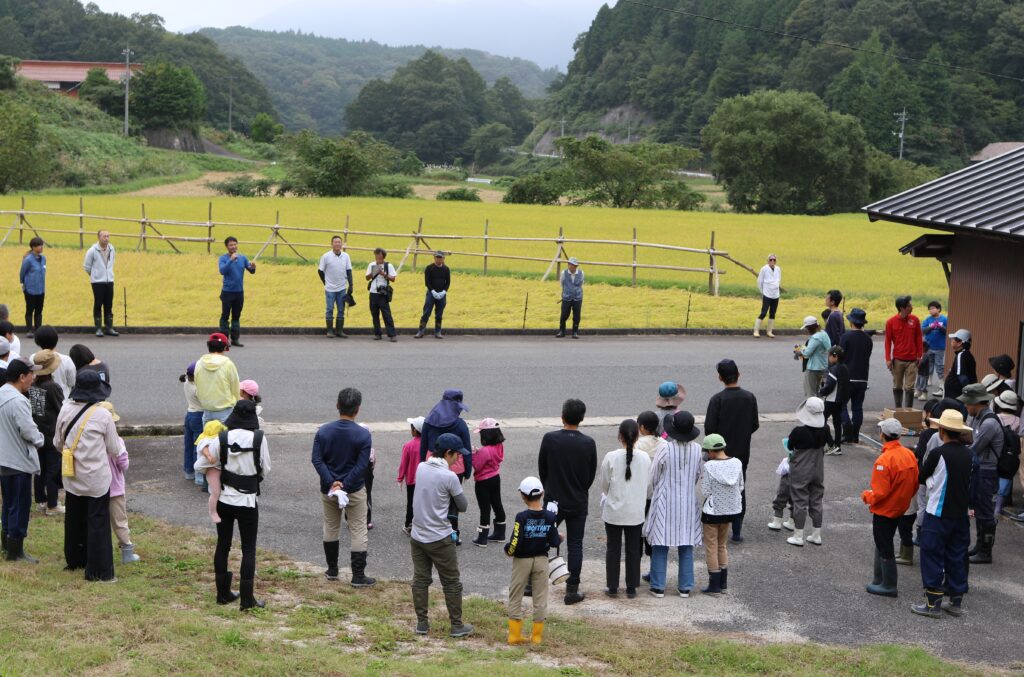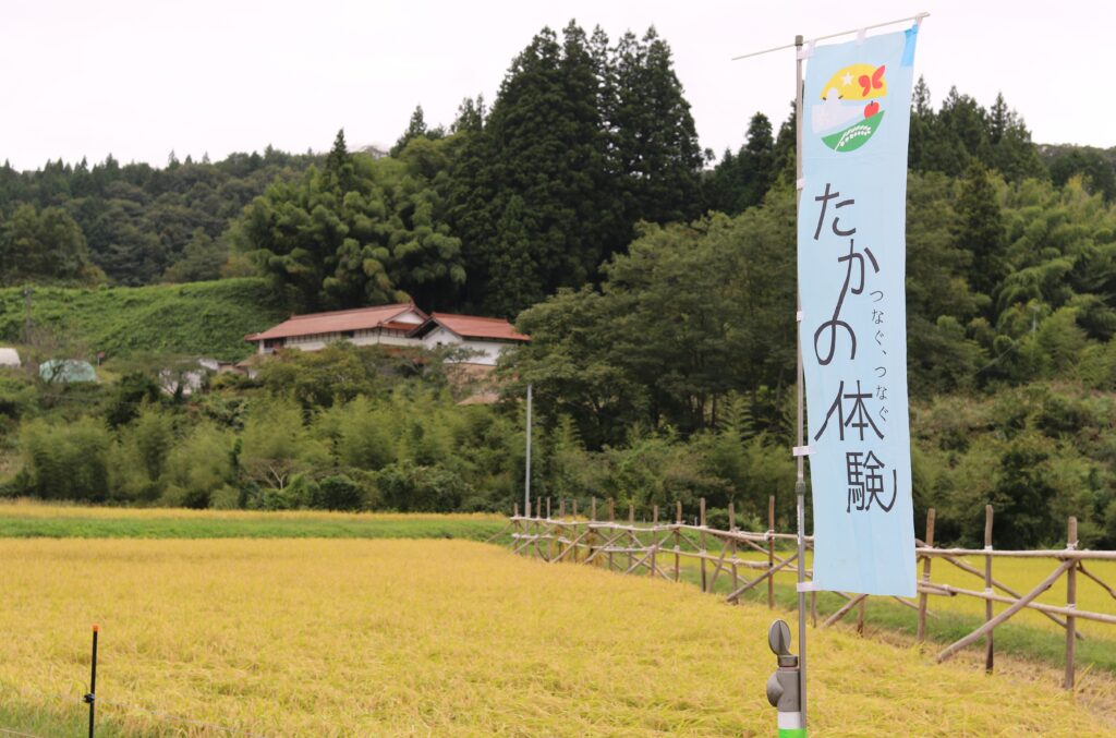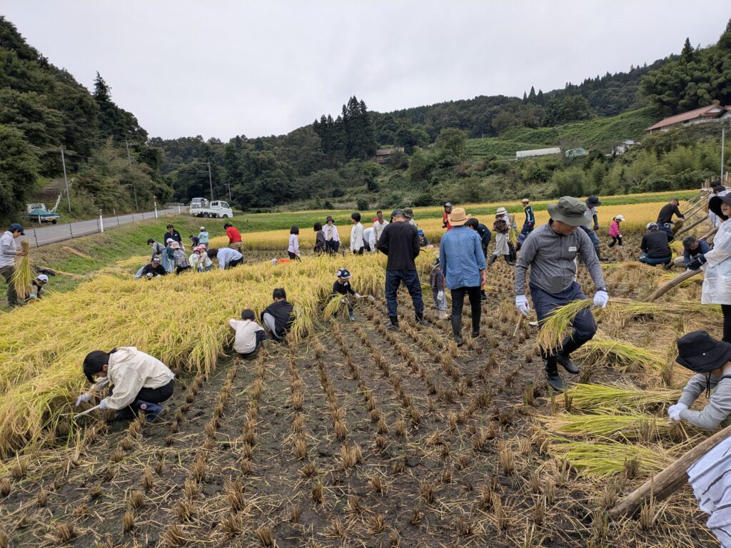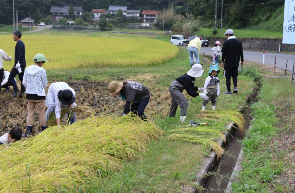 9月後半になり高野町では稲刈りの最盛期を迎えました。5月に春のたかの体験で手植えしたコシヒカリも順調に育ち、稲刈りの時期になりました。そして、9月28日に『たかの体験(秋) 稲刈り体験と新米羽釜ご飯炊きと栗拾い』にて、参加者の皆さんと一緒に稲刈り体験を楽しみました。