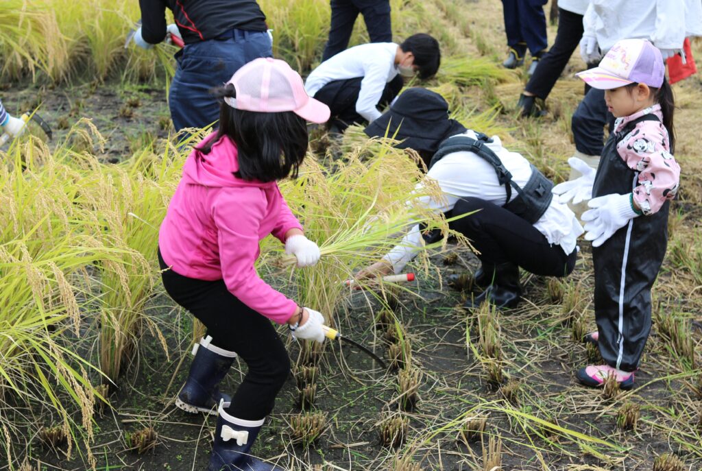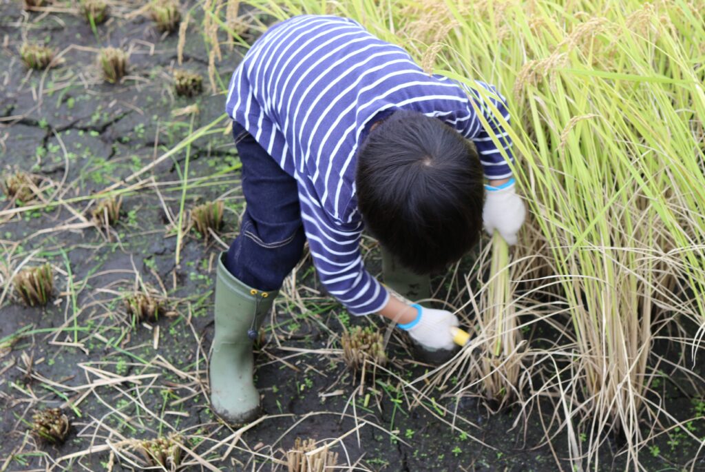 稲刈りのやり方をおしえてもらっい、約5アールの面積を1時間かけて刈っていきました。小さなお子さんも一生懸命に刈ってくれました。