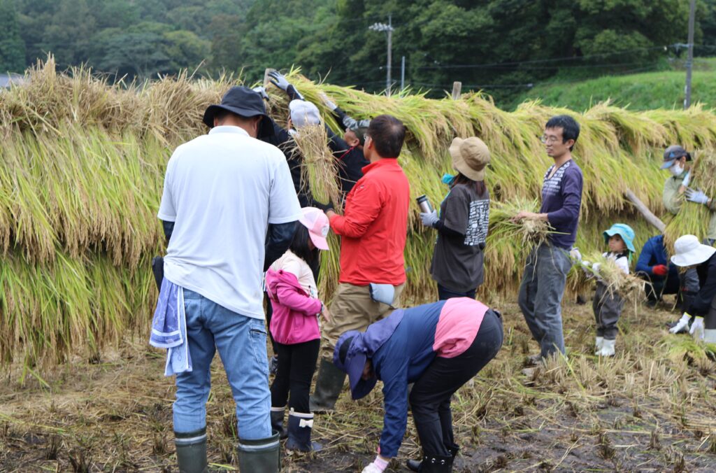 刈った稲は藁で束ねて、はで干しにしていきます。刈った稲をはでまで田んぼの中を歩いて運ぶのは結構な重労働ですが、みなさんどんどん運んでくれました。