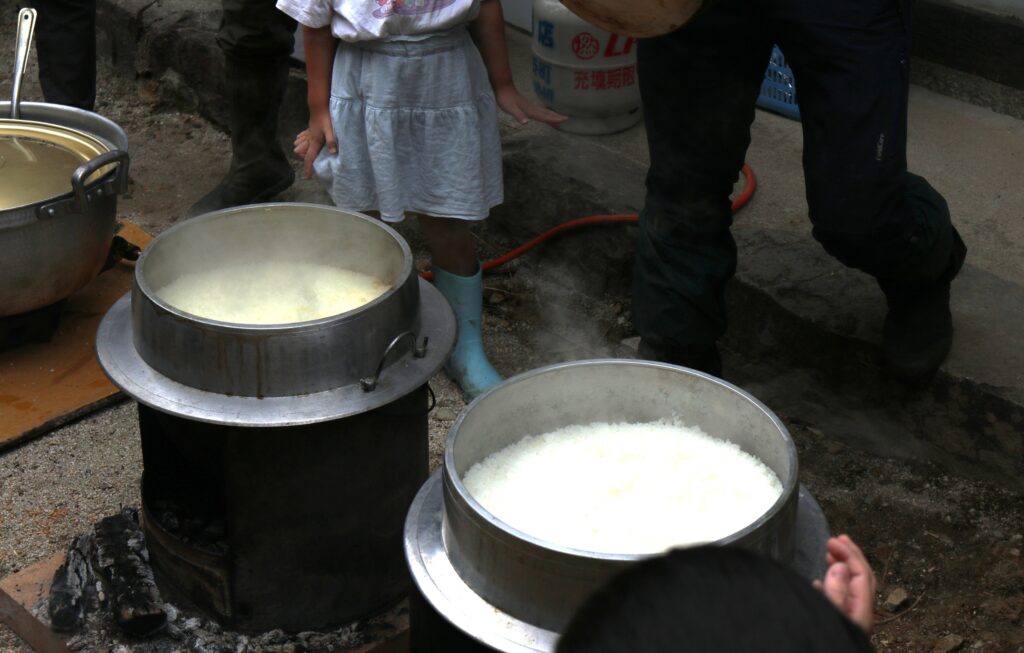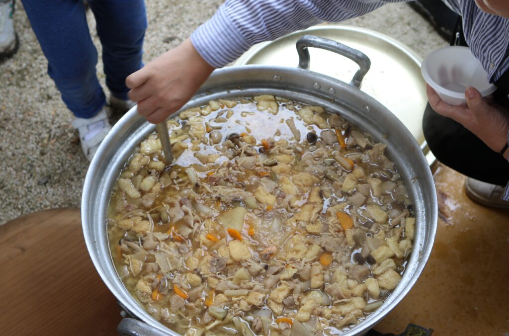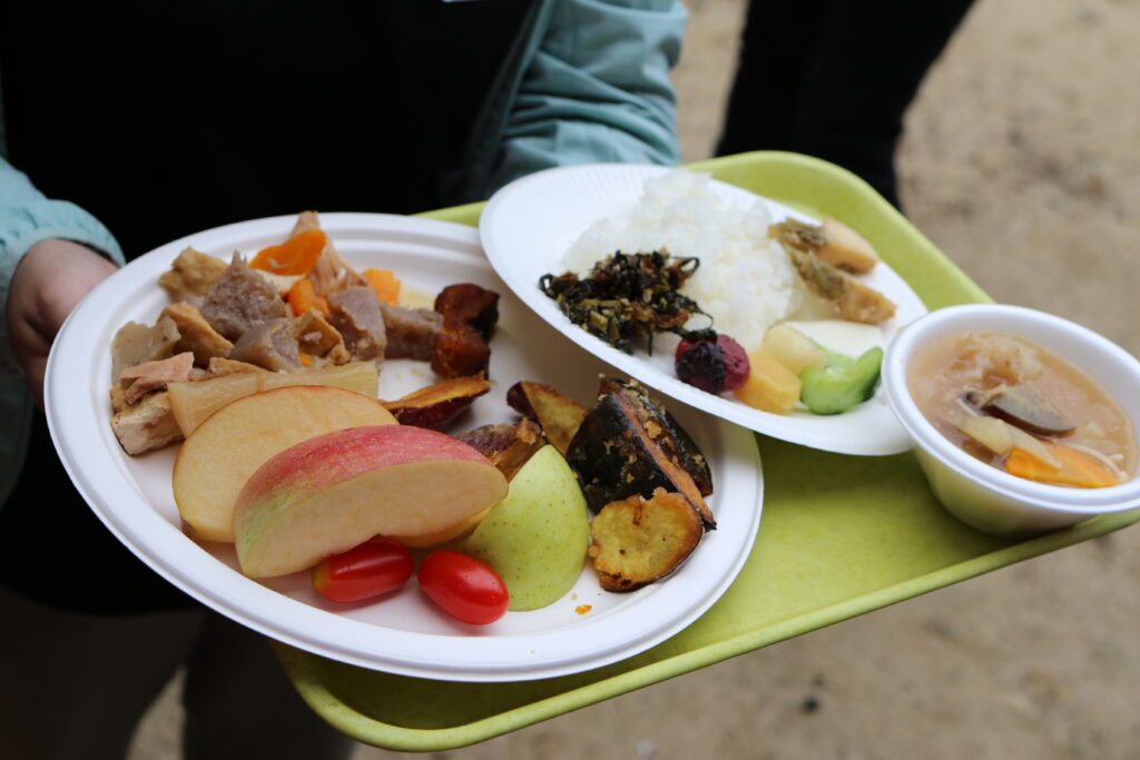 稲刈りの後は、お待ちかねのお昼御飯です。羽釜で炊いた8升の新米に高野産の食材を使った、豚汁や煮物などの田舎料理、地元の漬物名人の漬物盛り合わせ、トマトやりんごなどが並びました。