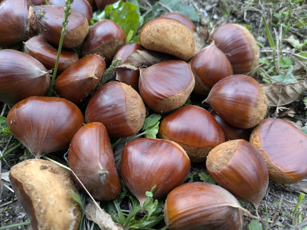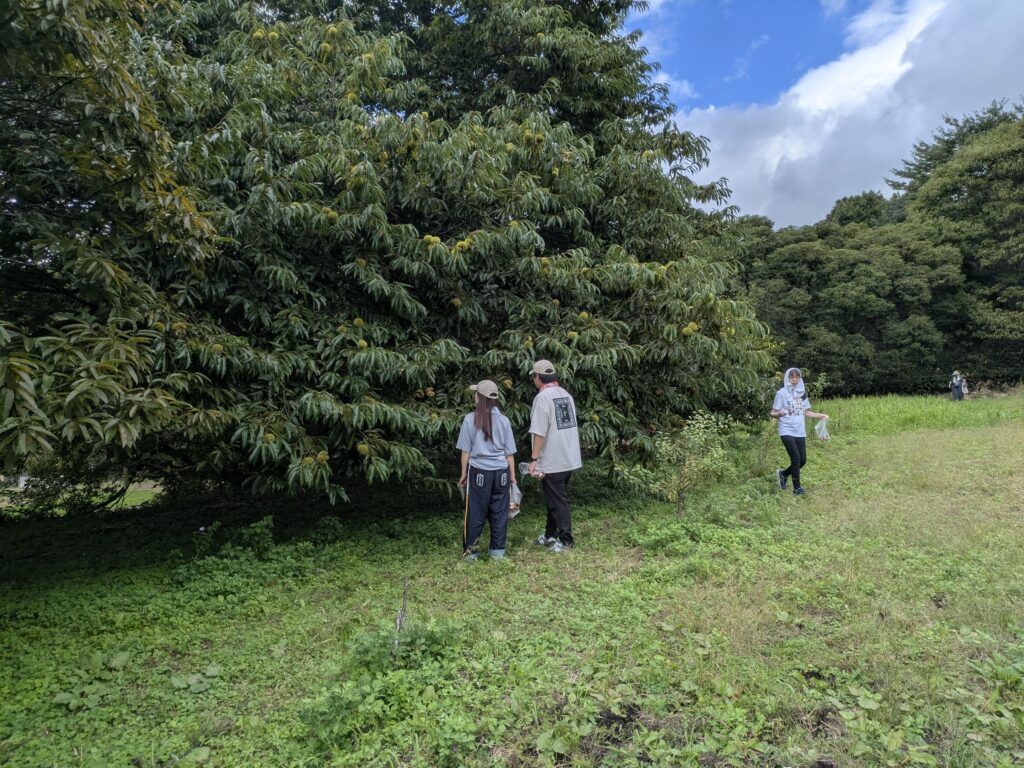 昼食を楽しんだ後は、古民家の裏山裾にのぼり、栗拾いをしました。この古民家は20本以上の大きな栗の木に囲まれていて、たくさんの栗がとれます。この日は少し時期が早かったですが、みなさん沢山の栗を拾って持って帰っていました。